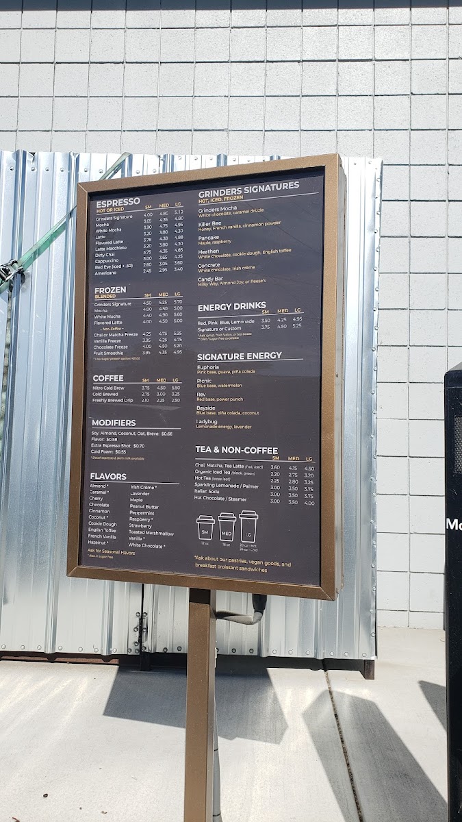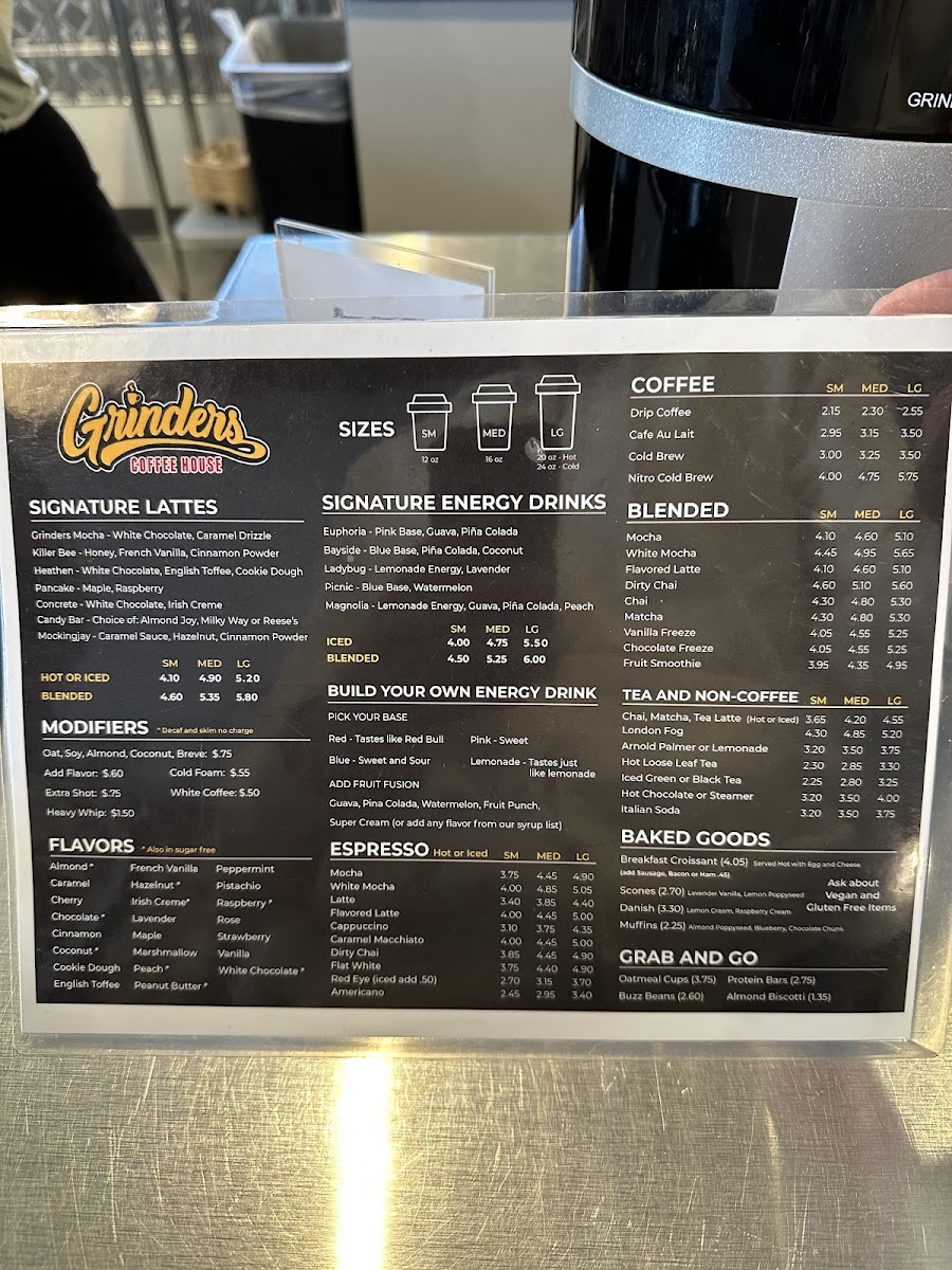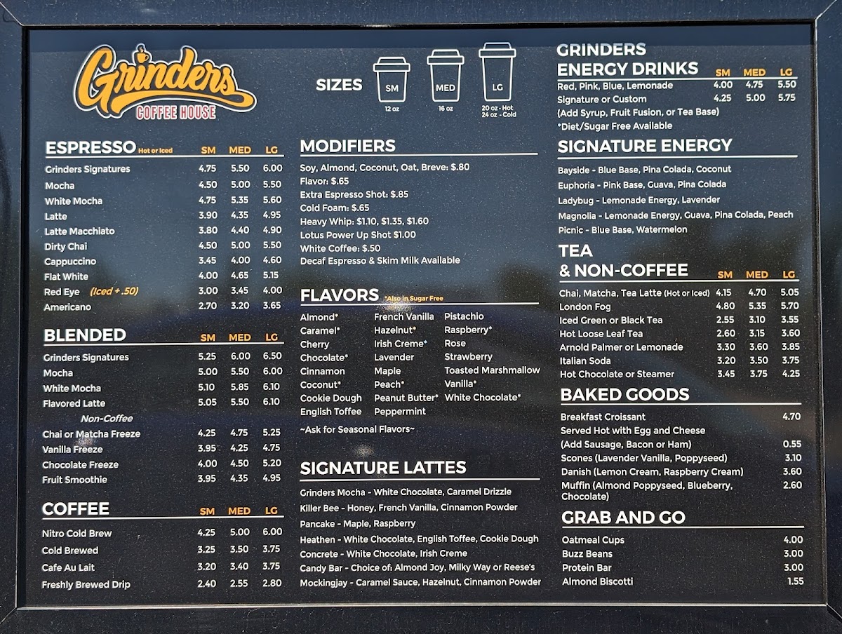For a richer experience, Grinders Coffee House offers signature blended drinks like Mocha, White Mocha, and flavored Lattes. The Signature Lattes section is filled with intriguing choices such as Grinders Mocha, Killer Bee, and Pancake Heathen, each with its unique blend of flavors. If you're looking for a boost, their Signature Energy drinks, like Bayside, Euphoria, and Ladybug Magnolia, are sure to energize you.