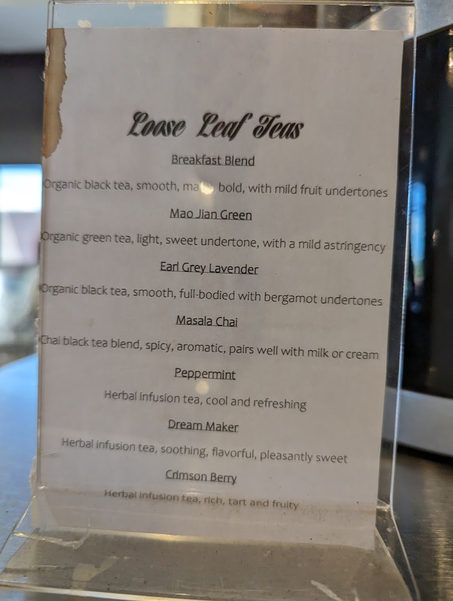 In addition to coffee, the tea selection is equally impressive. Whether you're in the mood for a soothing Chai, a classic London Fog, or a refreshing Iced Green or Black Tea, there's something for every tea lover. Hot Loose Leaf Teas, such as Breakfast Blend, Mao Jian Green, and Earl Grey Lavender, are also available for those seeking a more traditional experience.